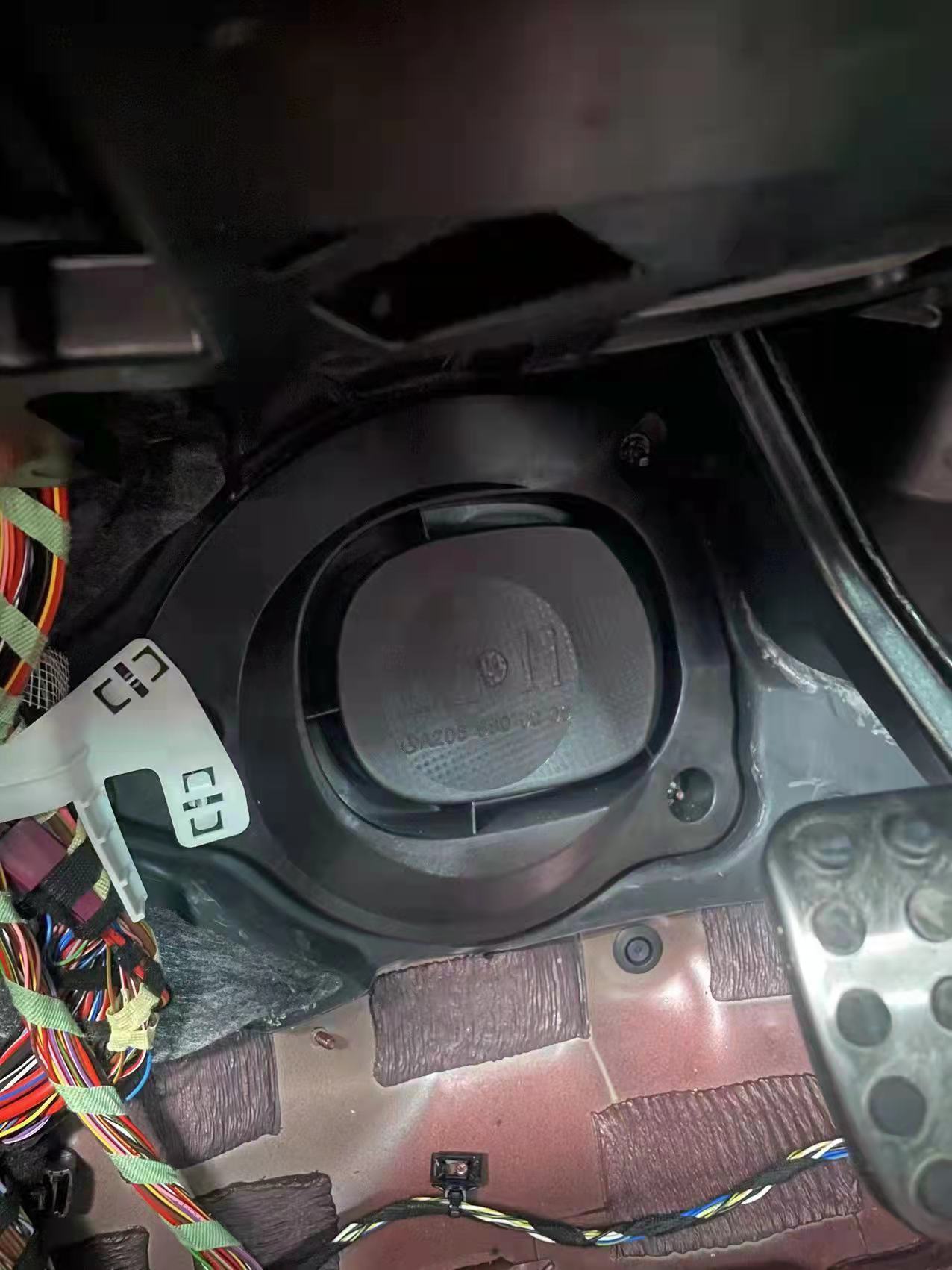 奔驰原车只有一个低音喇叭,隐藏在副驾驶脚下。主驾下边是个塑料壳。